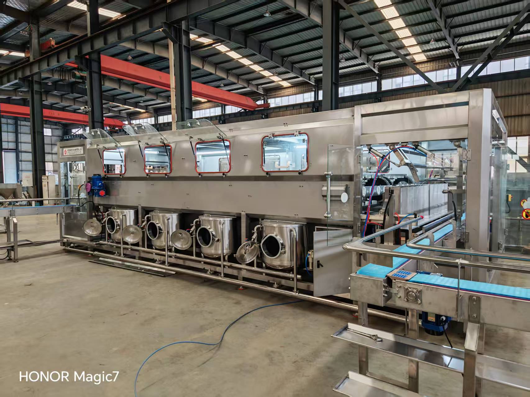 該設(shè)備集自動拔蓋、自動外刷桶、自動上瓶機(jī)構(gòu)、自動洗瓶消毒、自動灌裝、自動套蓋、自動壓蓋和燈檢、熱縮膜、提桶套袋、成品送出為一體,使用的原材料符合食品行業(yè)和其他行業(yè)要求。該設(shè)備采用AC380V電源.