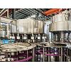 該機(jī)的生產(chǎn)過程如下:瓶子通過分瓶撥輪傳送至三合一灌裝機(jī)的沖瓶機(jī)上。沖瓶機(jī)的回轉(zhuǎn)盤上裝有卡瓶口式不銹鋼瓶夾,瓶夾夾住瓶頸翻轉(zhuǎn)180°使瓶口向下。在沖瓶機(jī)的定區(qū)域,特制噴嘴噴出沖瓶水,對瓶子內(nèi)壁進(jìn)行沖洗。瓶子經(jīng)沖洗、瀝干后在瓶夾夾持下再翻轉(zhuǎn)180°使瓶口向上。洗凈后的瓶子通過輸送帶沖導(dǎo)出并傳送至灌裝機(jī)。進(jìn)入灌裝機(jī)的瓶子由提升氣缸上的瓶夾卡住瓶口保持,并在凸輪作用下實現(xiàn)上升與下降。灌裝機(jī)采用重力灌裝方式,瓶口上升頂開灌裝閥開始灌裝。灌裝結(jié)束后瓶口下降離開灌裝閥,瓶子通過輸送入旋蓋機(jī)。旋蓋機(jī)上的止旋刀卡住瓶頸部位,保持瓶子直立并防止旋轉(zhuǎn)。旋蓋頭在旋蓋機(jī)上保持公轉(zhuǎn)并自轉(zhuǎn),在凸輪作用下實現(xiàn)抓蓋、套蓋、旋蓋、脫蓋動作,完成整個封蓋過程。成品瓶通過出瓶撥輪從旋蓋機(jī)傳送到出瓶輸送鏈上,由輸送鏈傳送出三合一灌裝機(jī)。整機(jī)采用落地式封窗,美觀、大方。