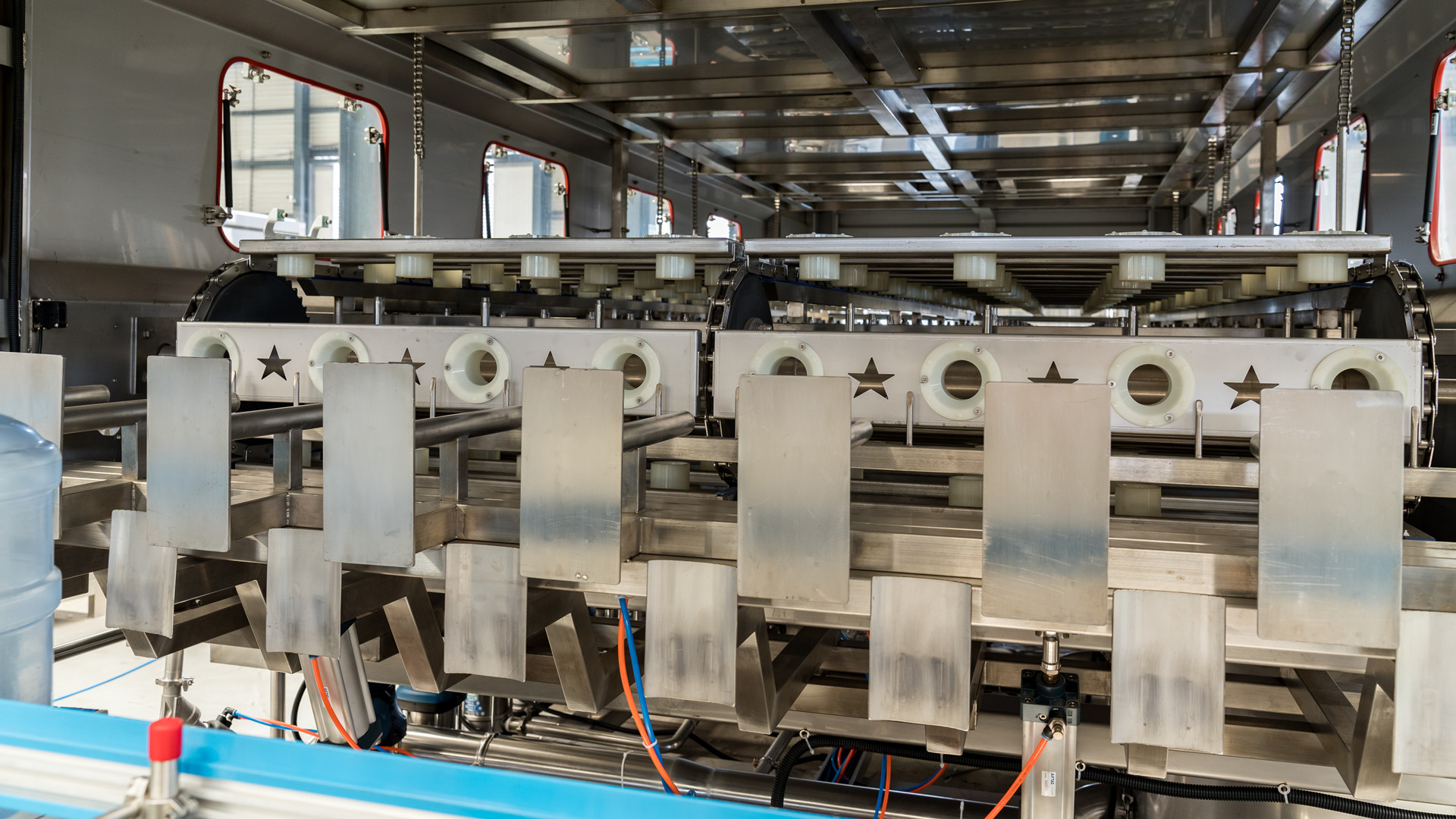 該設(shè)備集自動(dòng)拔蓋、自動(dòng)外刷桶、自動(dòng)上瓶機(jī)構(gòu)、自動(dòng)洗瓶消毒、自動(dòng)灌裝、自動(dòng)套蓋、自動(dòng)壓蓋和燈檢、熱縮膜、提桶套袋、成品送出為一體,使用的原材料符合食品行業(yè)和其他行業(yè)要求。該設(shè)備采用AC380V電源.